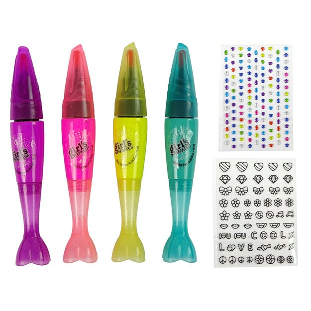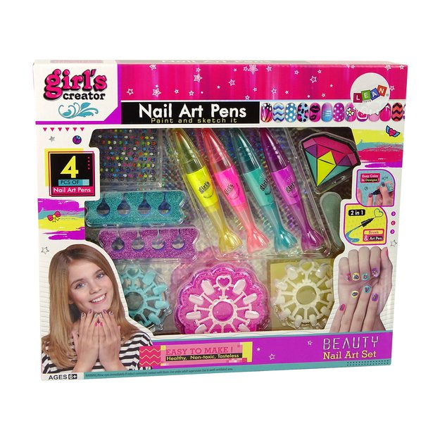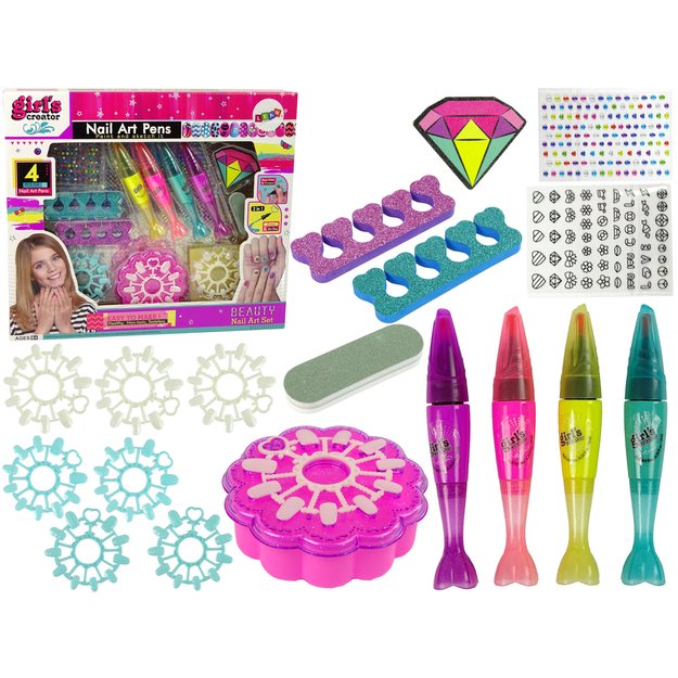 Išlyginę nagų ilgį ir formą deimantine pildele, užtepkite ant nagų pasirinktą spalvą. Rašikliai leis tiksliai nupiešti dizainą, jų yra keturių spalvų. Piešdama raštus mergaitė lavina tikslumą ir kuria savo stilių. Lipdukai ir deimantai suteiks originalumo ir žavesio. Kolegos mokykloje ar darželyje tikrai žavėsis. Su šiais aksesuarais sukursite gražų dizainą ant nagų, dažai labai greitai džiūsta, todėl greitai galėsite džiaugtis gražiu manikiūru.