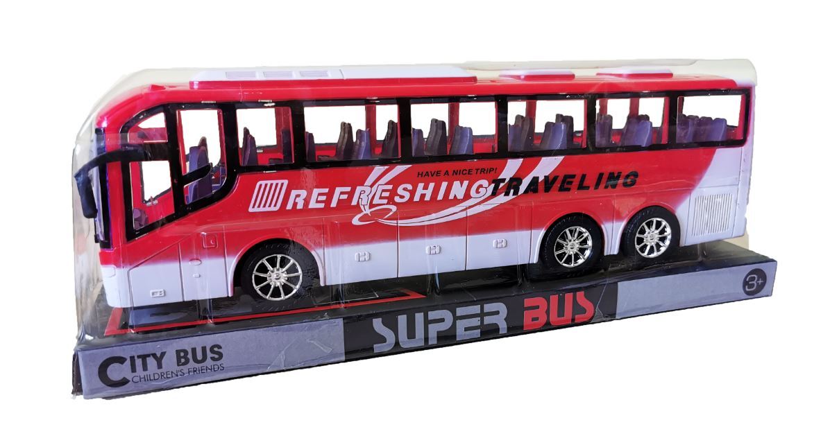 Ryškus plastikinis autobusas. Inercinis, pastūmus greitai važiuoja. Patiks kiekvienam vaikui.