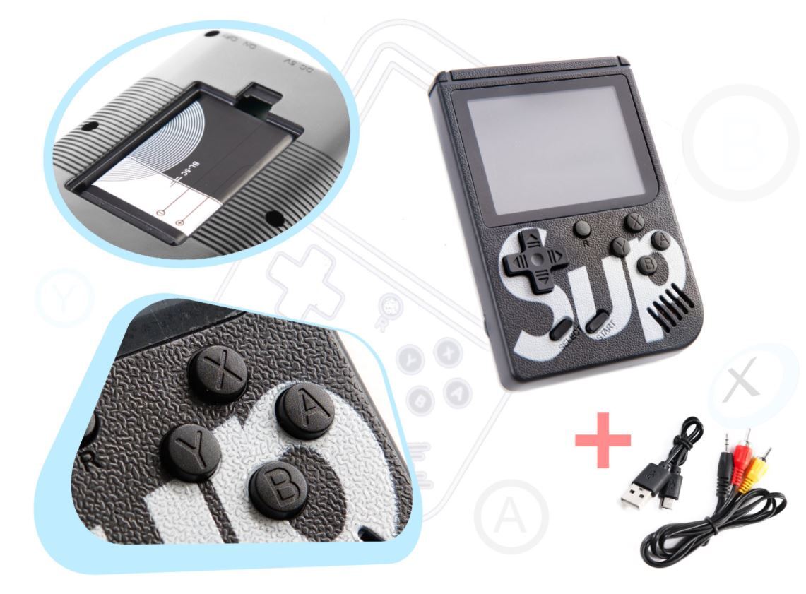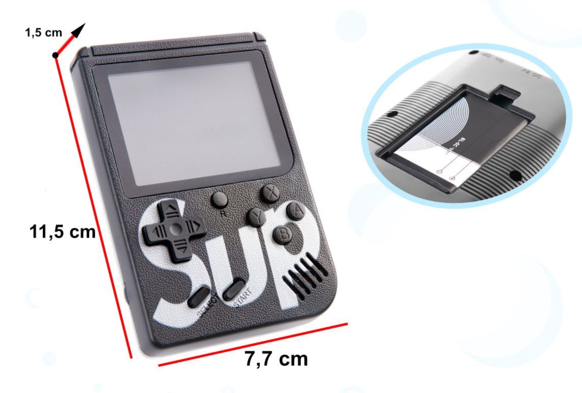 Komplekte: konsolė, baterija, USB ir AV laidas. Žaidimo išmatavimai: 11,5x7,7x1,5 cm.