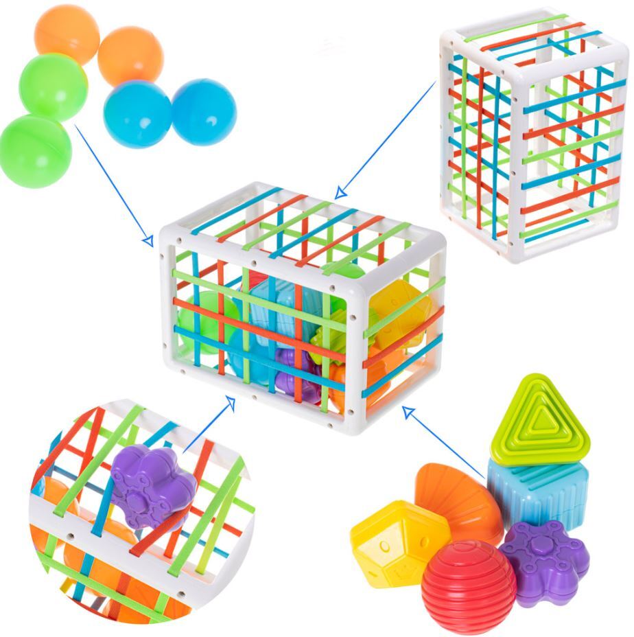 Tai susideda iš blokų išspaudimo per gumines juostas, norint juos įdėti į kubą arba išimti! Kuo žaislas paprastesnis, tuo daugiau galimybių jis suteikia! Tiesą sakant, žaidimų skaičius neribojamas, viskas priklauso nuo ryškios vaiko ir tėvų vaizduotės!