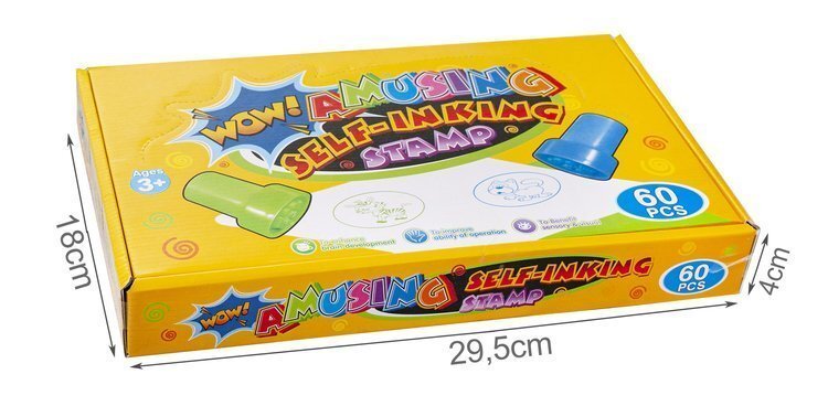 - 60 VIENETU RINKINJE - pakuoteje yra net 60 antspaudu su ivairiais raštais, kurie Jusu mažyliui garantuoja daugybę idomiu pramogu valandu. Antspauduose yra raštu, pvz., gyvunu arba jaustuku .