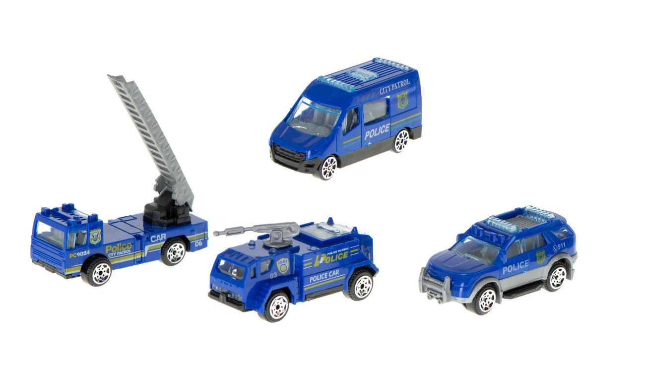 Komplekte yra: 4 automobiliai, atsuktuvas, kelio ženklai.