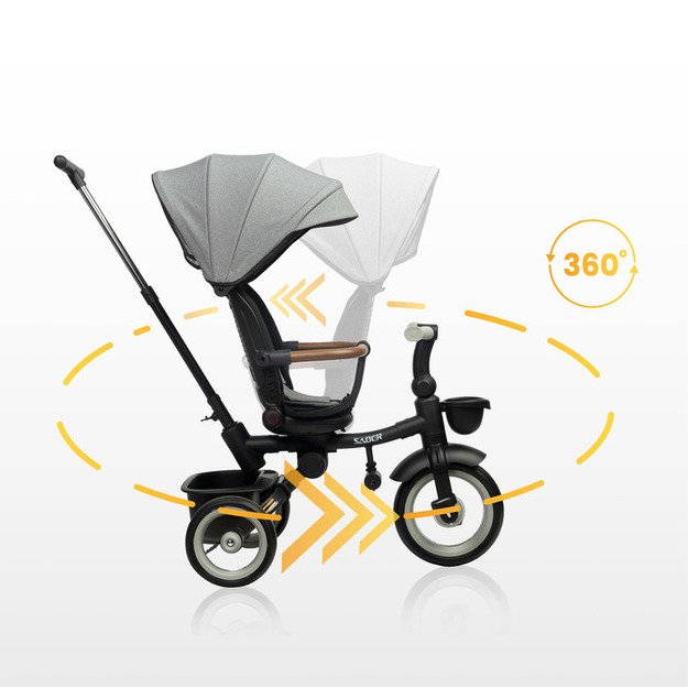 A swivel seat with an option to recline the backrest almost completely ensures comfort during walks. Additionally, two practical storage compartments — at the front and back of the bike — enhance its functionality.