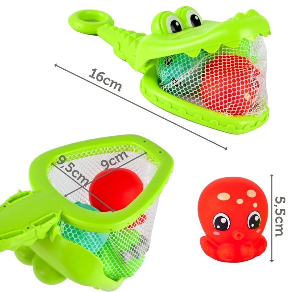 Krokodilo ilgis 16 cm, Žaislų matmenys: aukštis apie 5.5 cm, tinklelio ilgis apie 12 cm, angos plotis 9x 9.5 cm.
