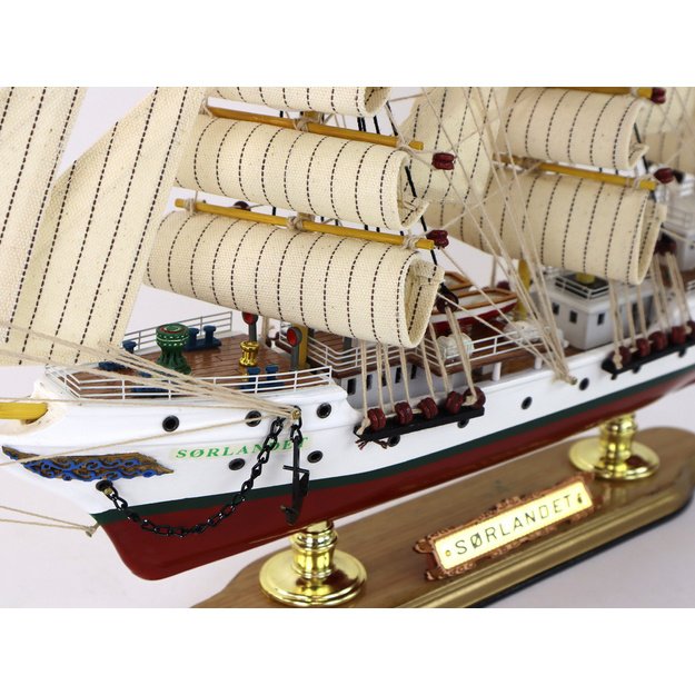 Šis modelis yra burlaivis Sorlandet. Šis pavadinimas yra ant medinio pagrindo, kuris suteikia autentiškumo ir leidžia identifikuoti šį konkretų laivą. Pačiame burlaivio viršuje matoma Norvegijos vėliava, pabrėžianti laivo kilmę ir jo ryšį su Norvegija.