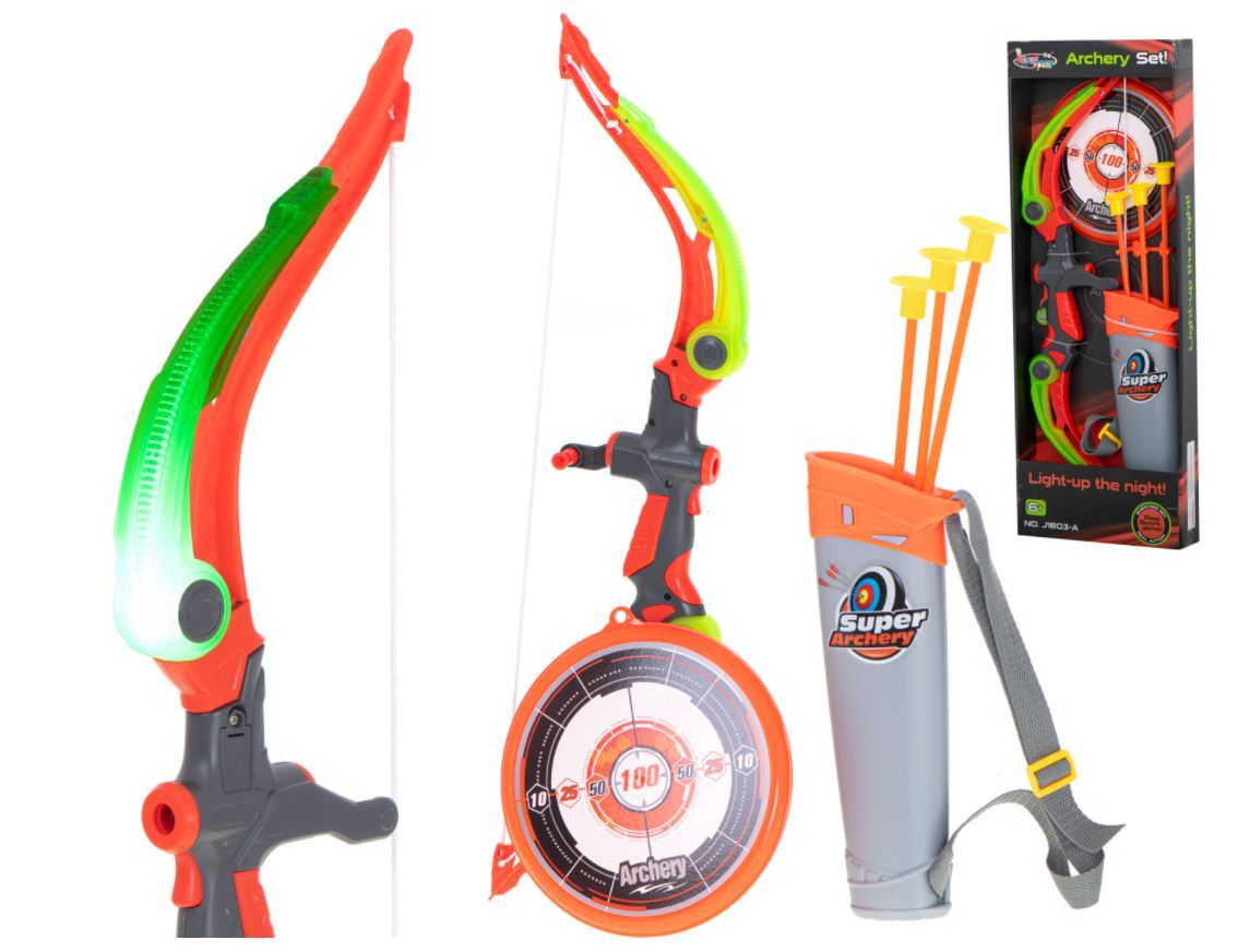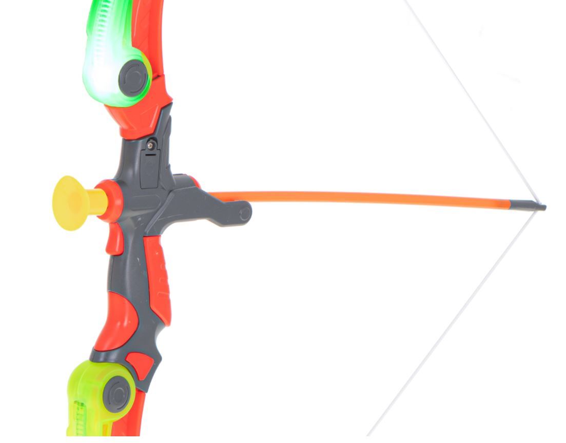 Rinkinį sudaro: skydas, lankas, virvelė su strėlėmis, 3 strėlės su siurbtukais. Maitinimas: 3x AG13 (įtraukta). Taikinio išmatavimai: 20 cm. Lanko ilgis: 53 cm.