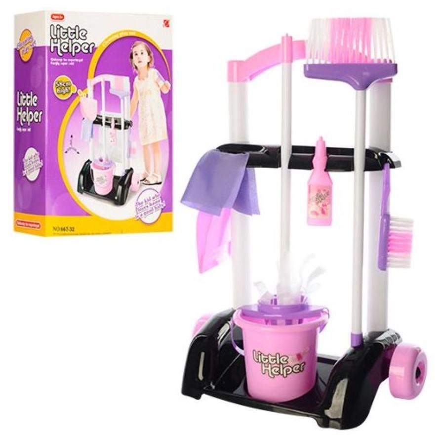 Žaislinis valymo rinkinys. Rinkinį sudaro: šluota, kibiras, šepetys, įvairūs kiti priedai.